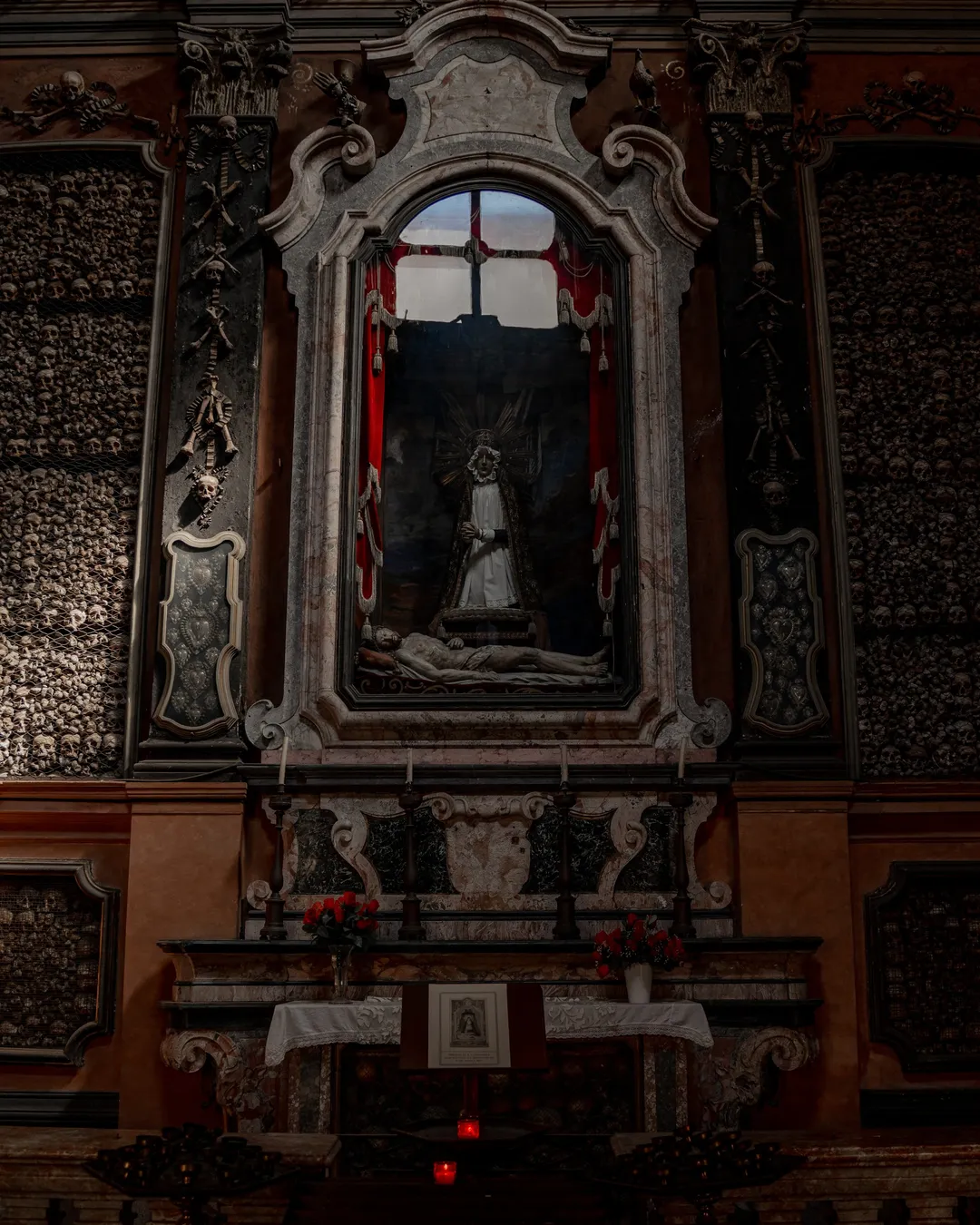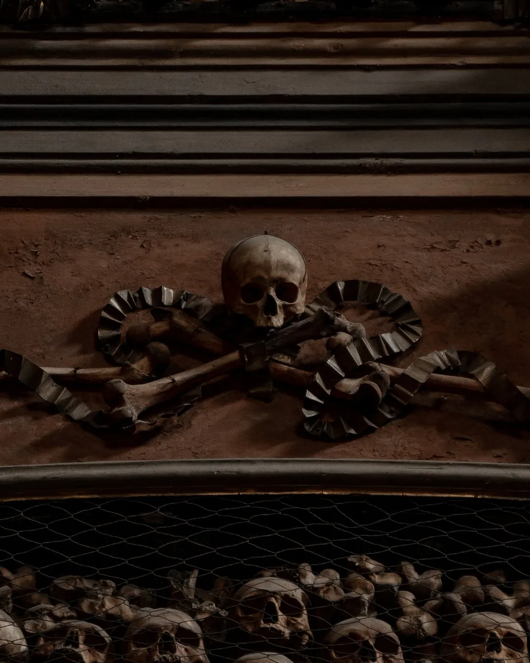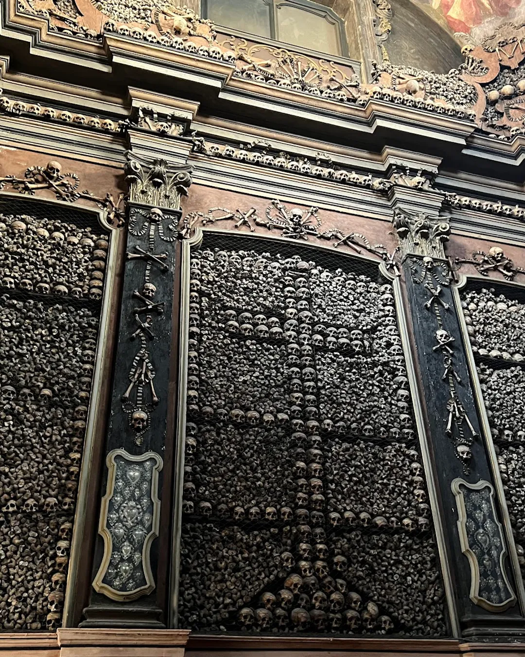 It is a truly astonishing artistic display of baroque design with the bones creating religious symbols such as crosses on the walls and decorative motifs that lead one’s eye up to the celling. The intricate design is thought to be the work of local monks and dates back to the time of the ossuary’s reconstruction in 1750, (which took place after the bell tower of the nearby Basilica di Santo Stefano Maggiore collapsed onto the vault due to a fire).