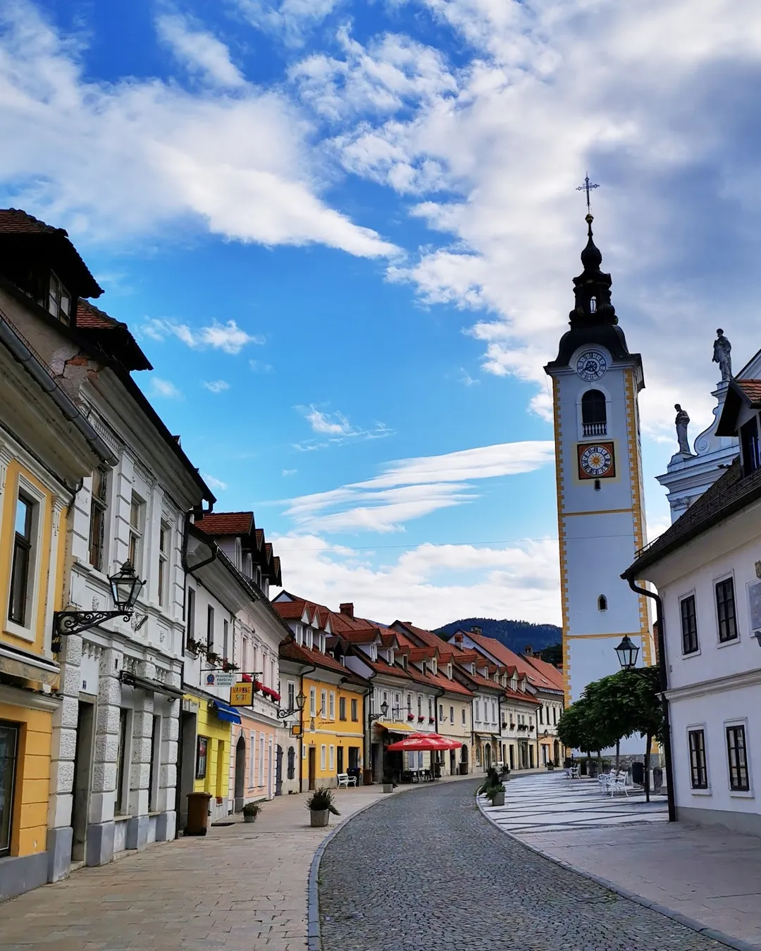 Fairytale town square with historic bell tower