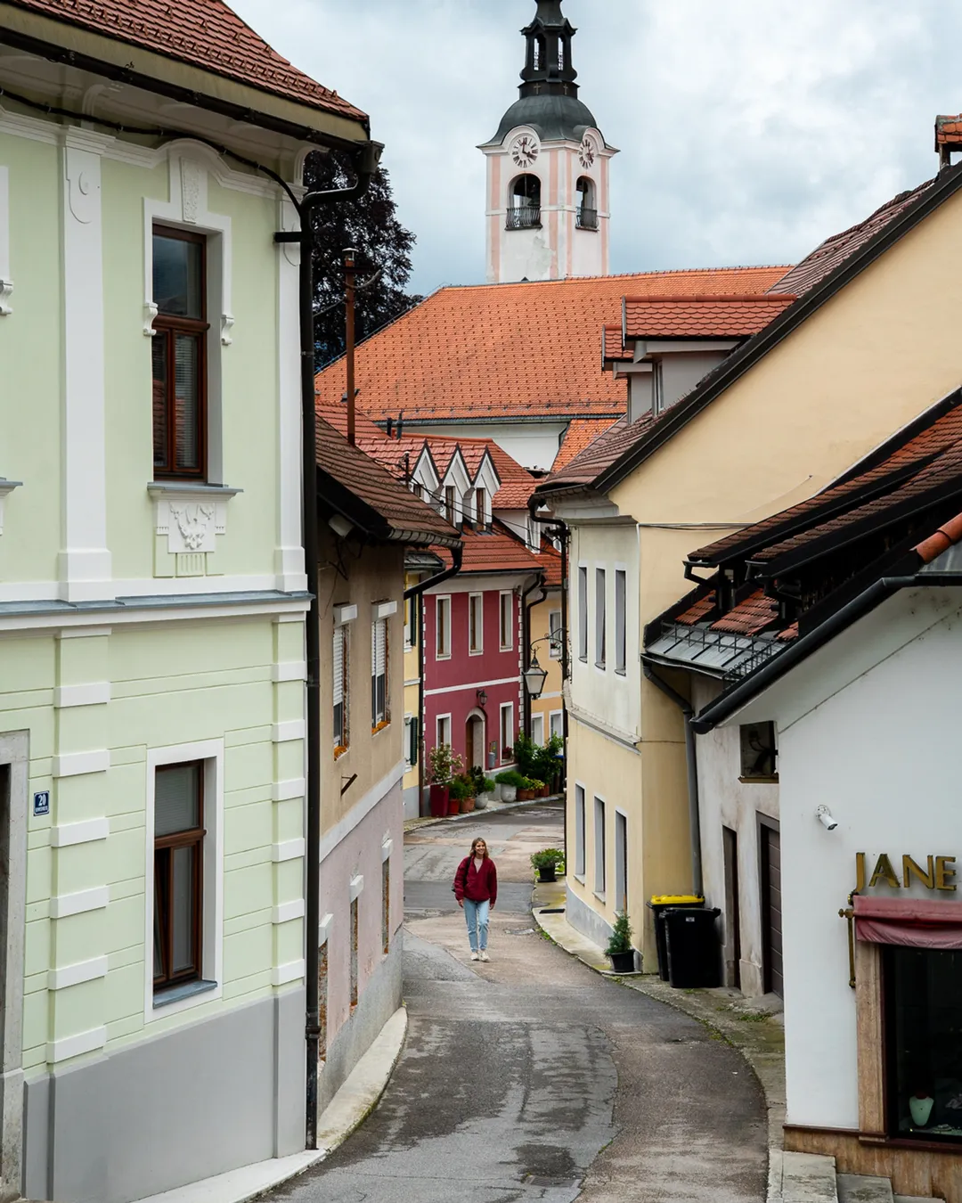 Scenic viewpoint of fairytale town at base of alps