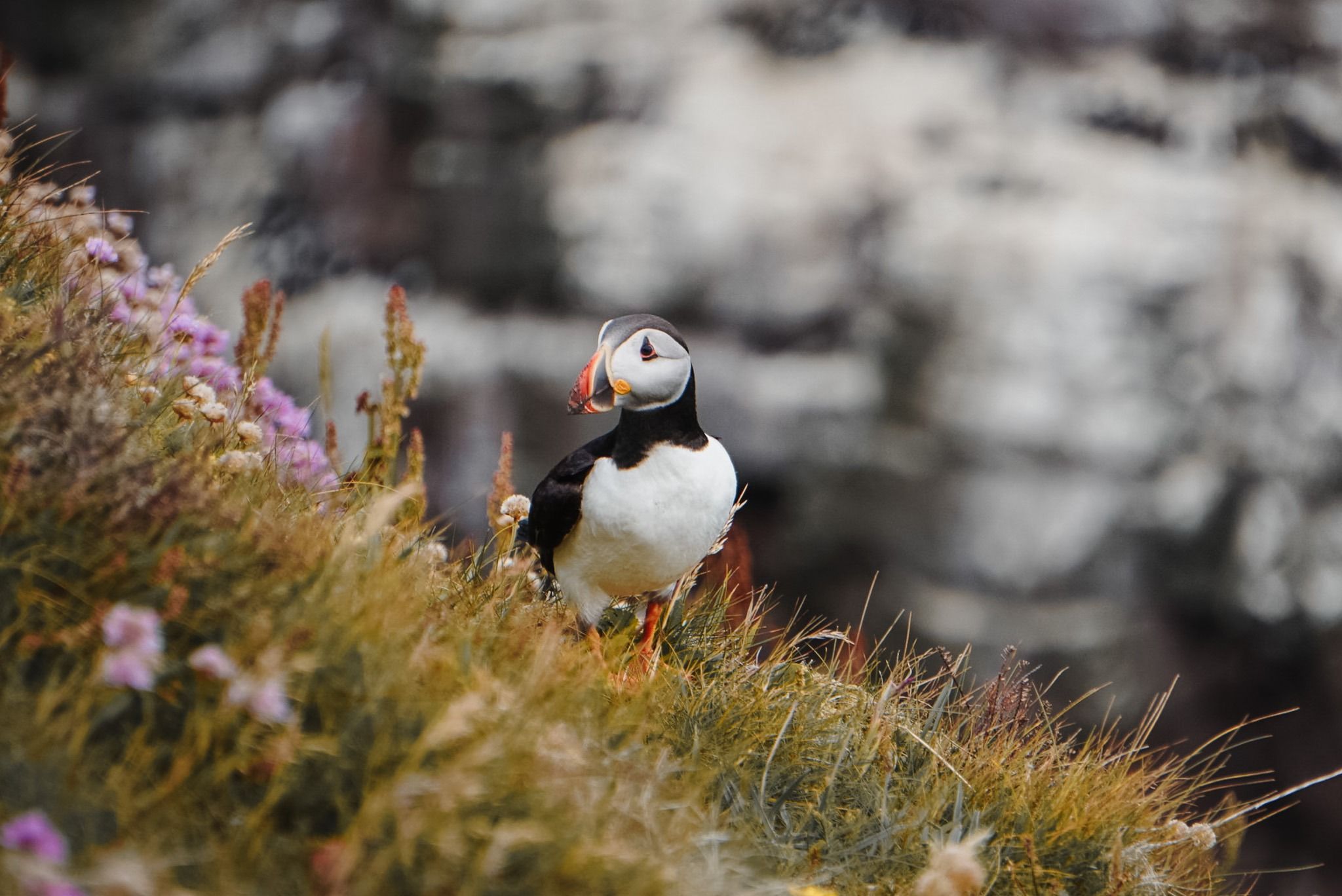 L' île de Handa est une réserve naturelle, réputée pour ses falaises spectaculaires et sa biodiversité . Ses falaises accueillent des milliers d'oiseaux marins (150 espèces), comme des des guillemots, des fulmars et surtout le célèbre (et tout mignon 😍) macareux 🐧 . Ce dernier est également appelé le Puffin, vous en avez certainement déjà vu ou entendu parler, avec son plumage noir et blanc et son bec orangé ! Notez que la meilleure période pour l'observation s'étend de mai à juillet, lorsque les oiseaux nichent sur l'île.