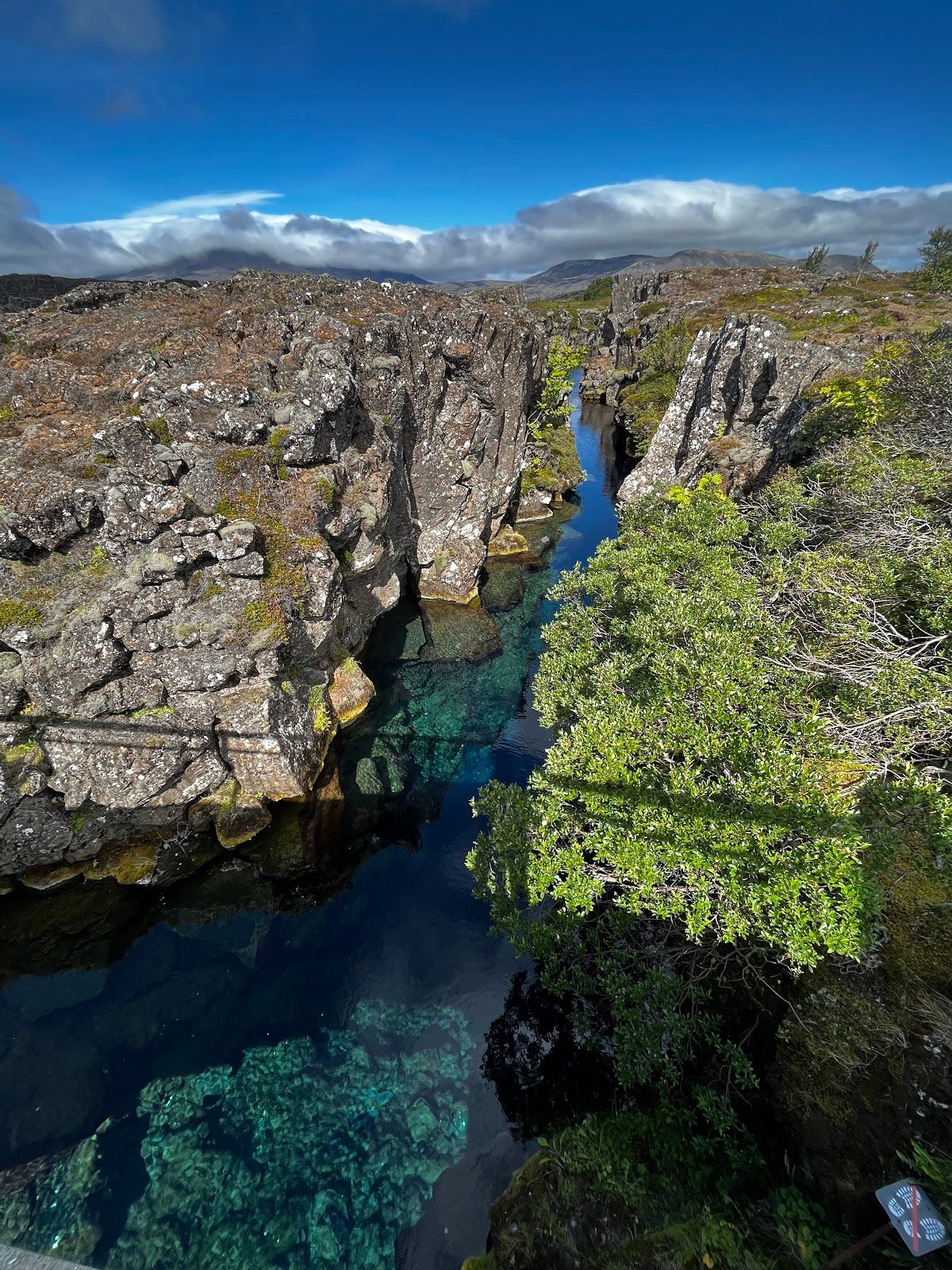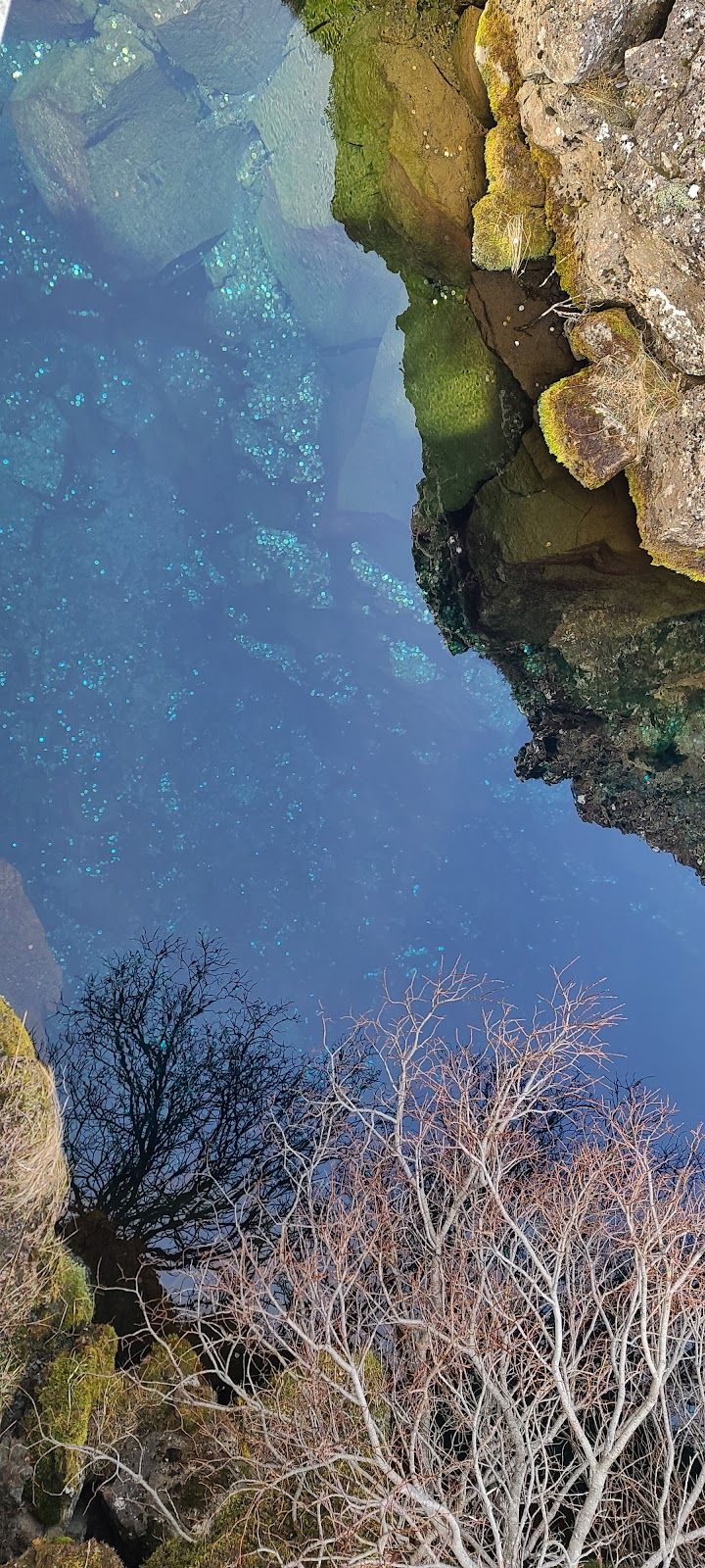 Peningagjá (Money Gorge) is a narrow water-filled fissure located near the visitor center in Thingvellir National Park. The name means “Money Gorge,” referring to a long-standing tradition of visitors throwing coins into the clear water for good luck. The fissure lies along the rift valley where the North American and Eurasian tectonic plates slowly drift apart. The shimmering coins resting on the bottom of the crystal-clear water and nearby bridge make it one of the most recognizable small features in the park.