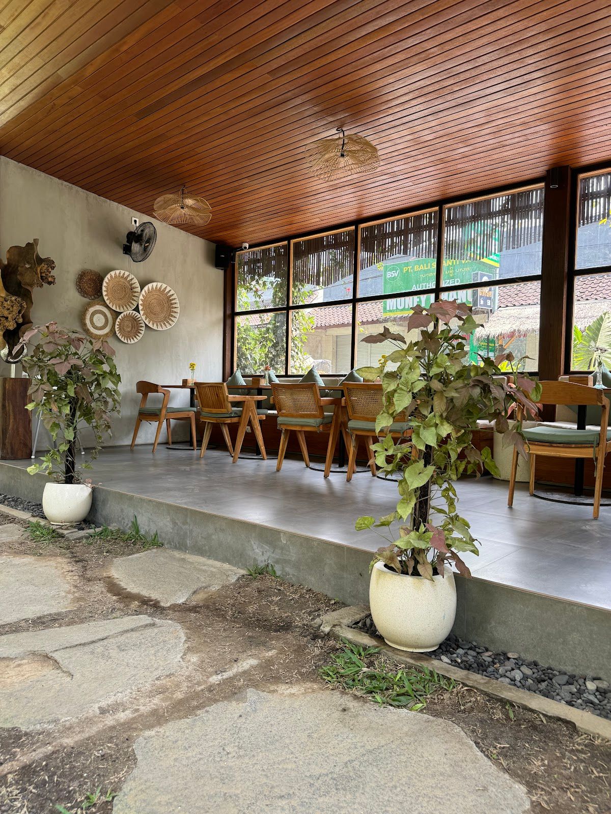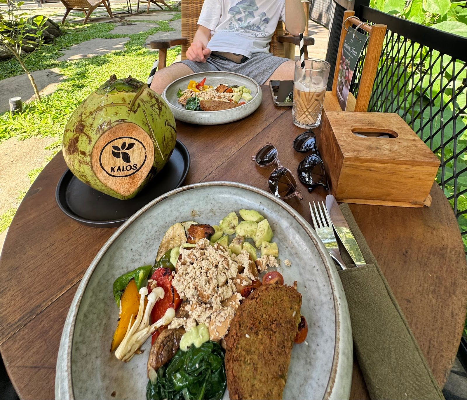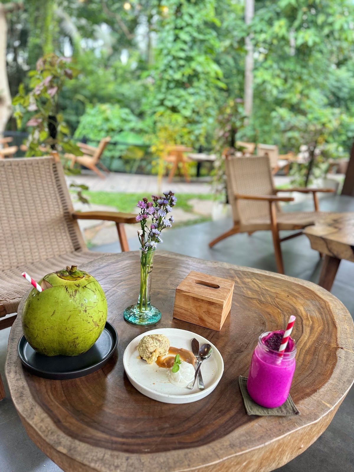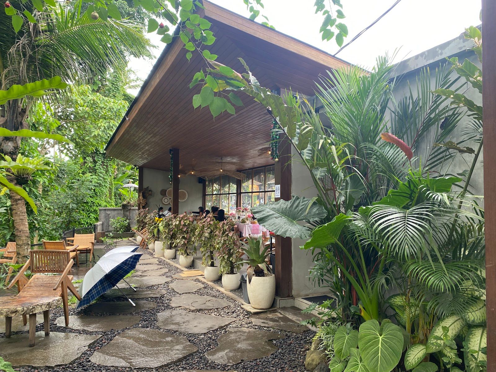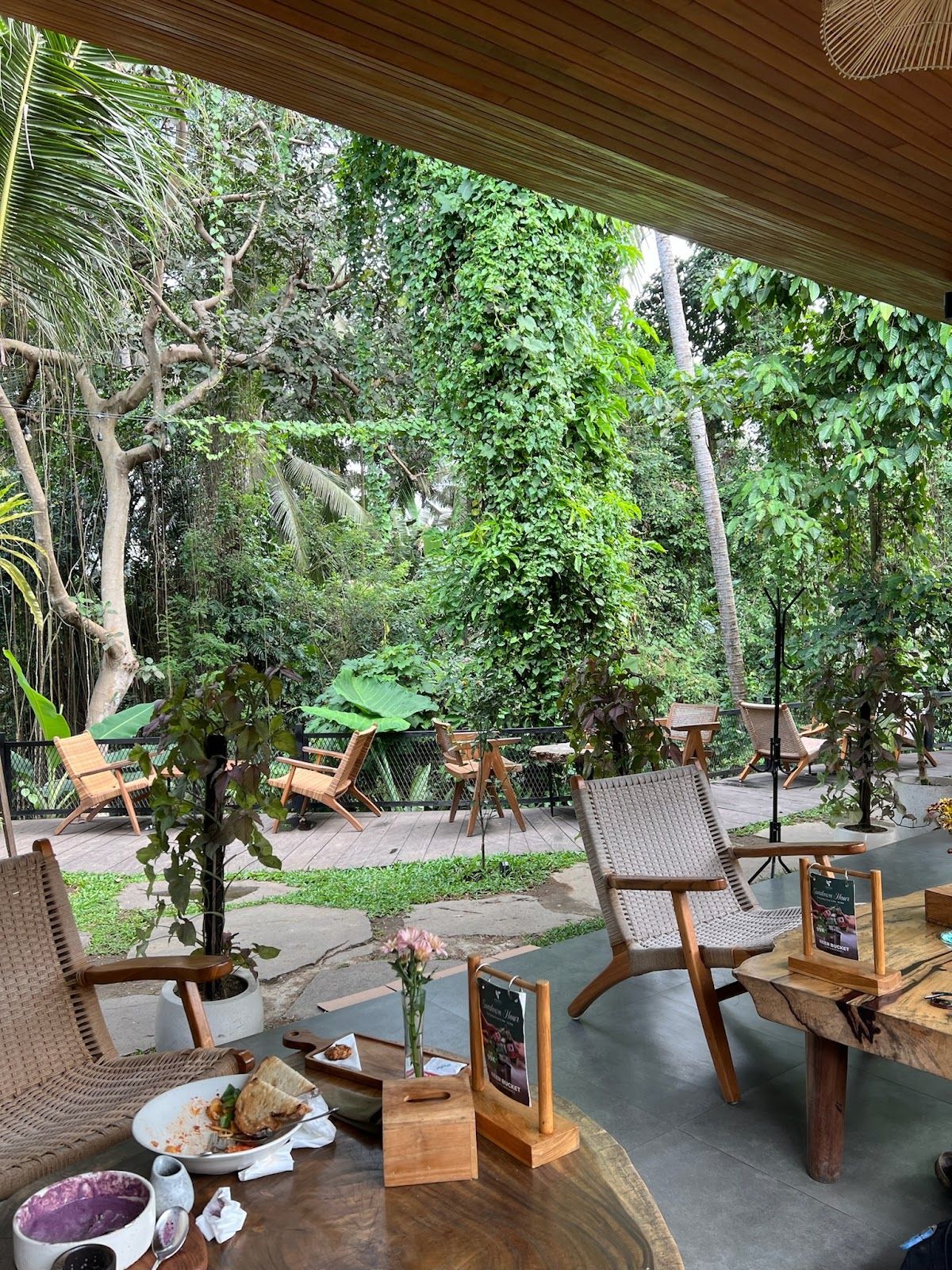 Cozy green outdoor café with delicious food
