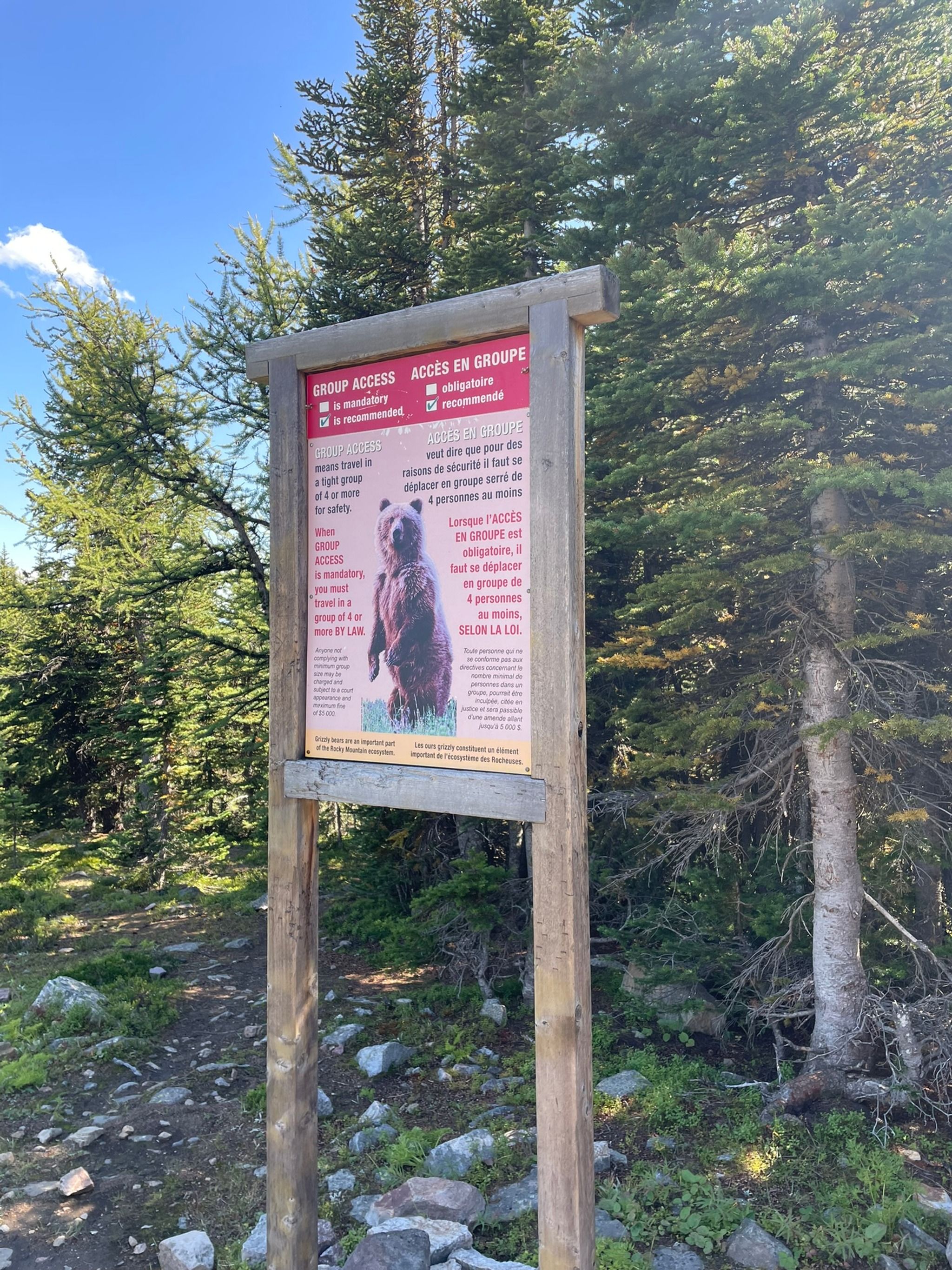 In some areas, especially in Canada, you’ll see warning signs about grizzly bears. Sometimes it’s just RECOMMENDED to hike in groups of 4 or more … and in certain places, it’s actually MANDATORY. Ignoring this rule can result in a hefty fine — and more importantly, puts both you and wildlife at risk.