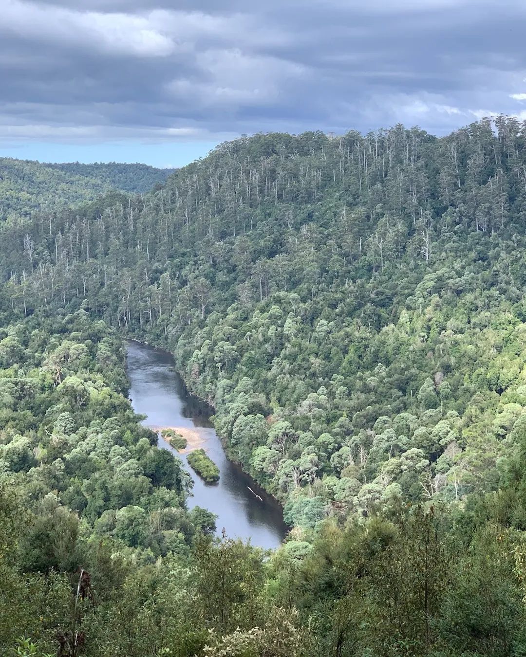 Sumac Lookout offers one of the most beautiful elevated views over the Arthur River as it winds through a deep, forested gorge. The platform sits above towering myrtle, sassafras, and leatherwood rainforest, giving you a true sense of the scale and untouched nature of the Tarkine.