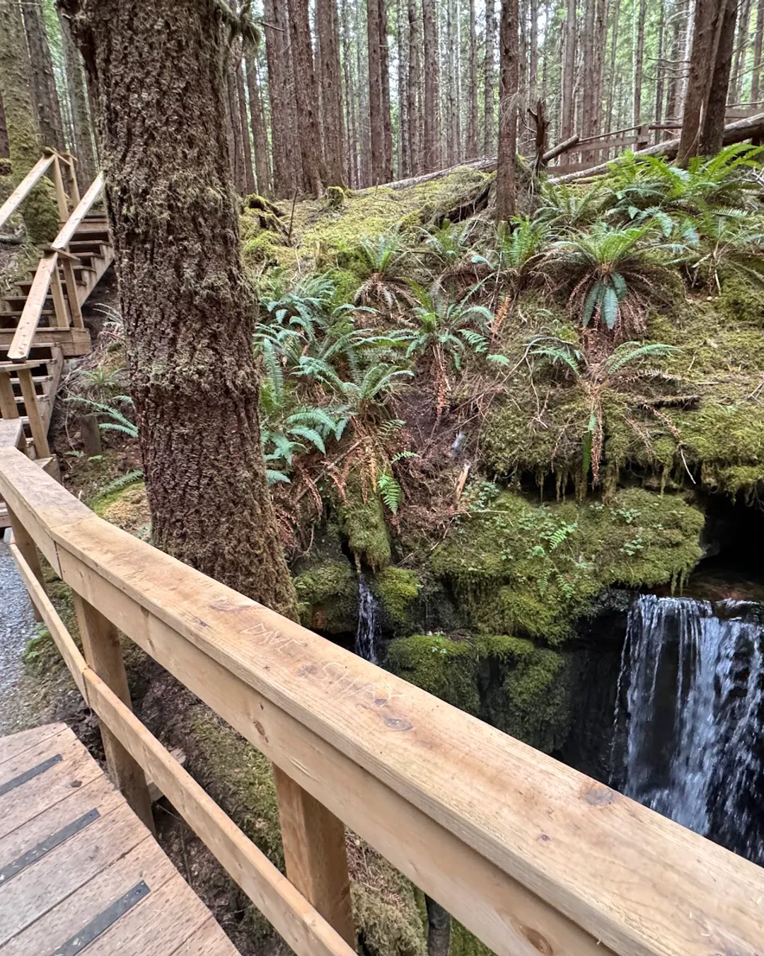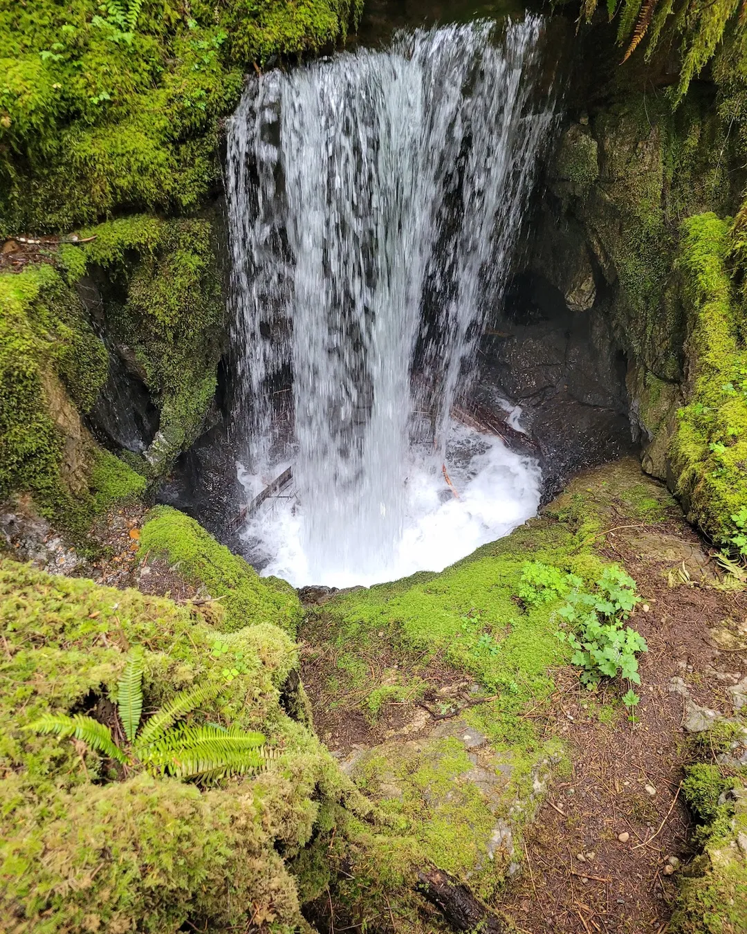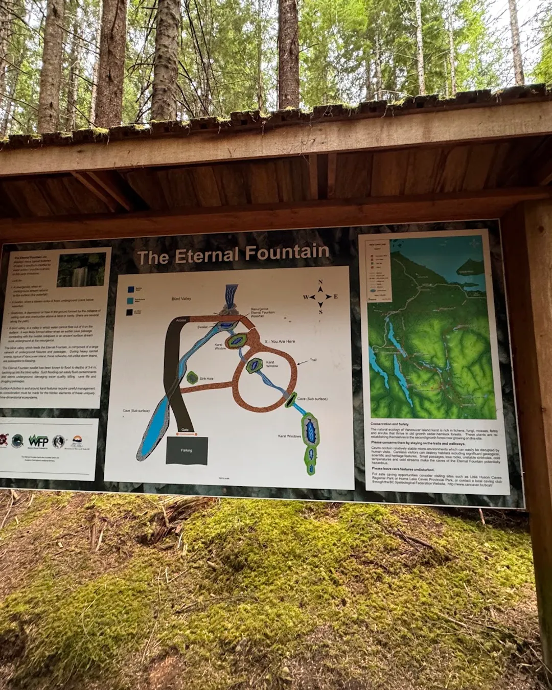 The Eternal Fountain is a unique stream resurgence waterfall located on Vancouver Island, BC, where a waterfall flows out of a rock face and disappears into a cave, or swallet. It's a day-use site on the Alice Lake Loop, featuring a short trail through a second-growth forest with opportunities to view karst features like dolines and disappearing streams.
