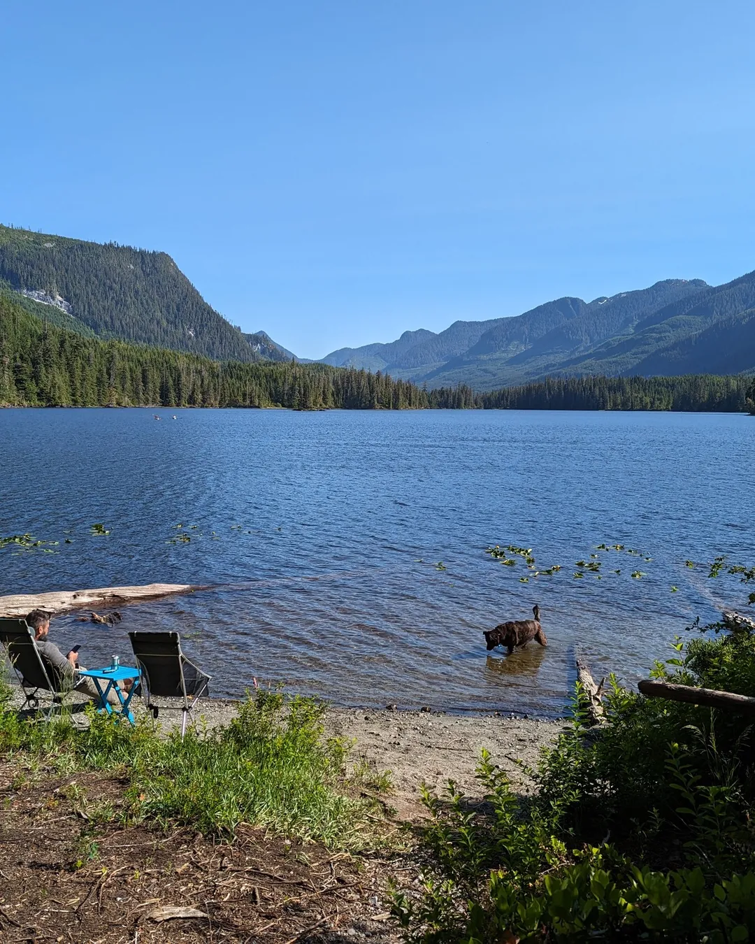 I've camped at this lake twice, and once we saw a Grizzly Bear walking the shoreline halfway down the lake from our canoe. It was an experience I had never expected. Living on the North Island for thirty-six years, Grizzly bears were something we never had to worry about. In the past twenty years, we have seen a population growth. Bears are amazing swimmers!