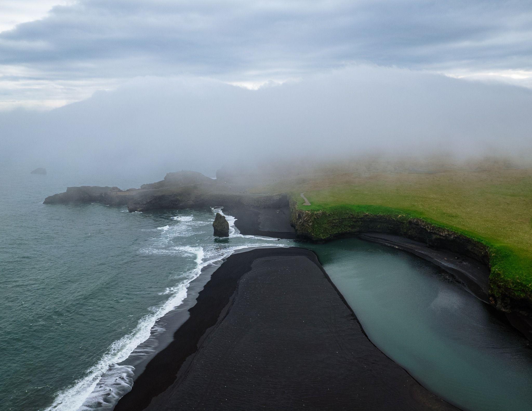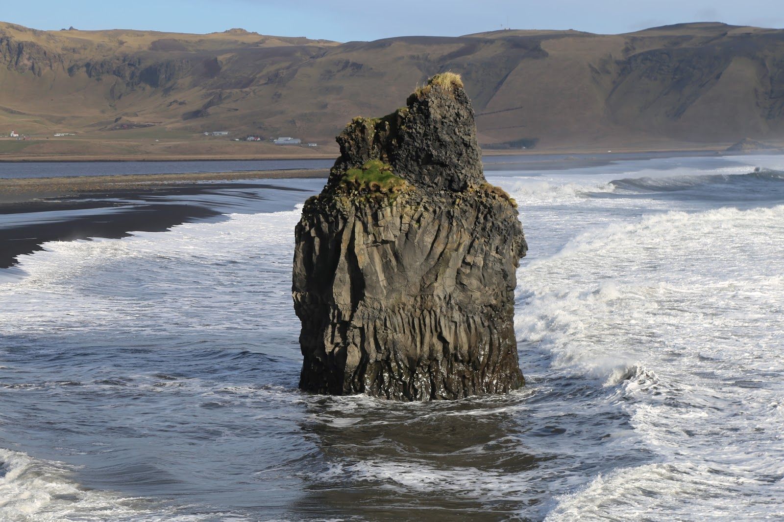 Lone sea stack by a black sand beach