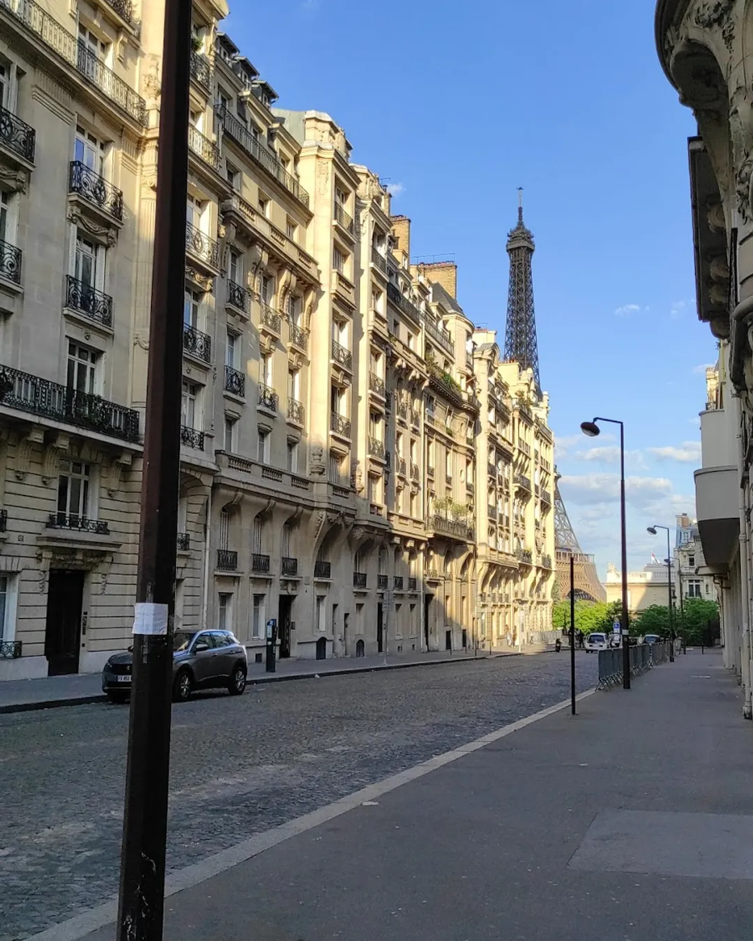 Charming cobblestone street with Eiffel Tower view