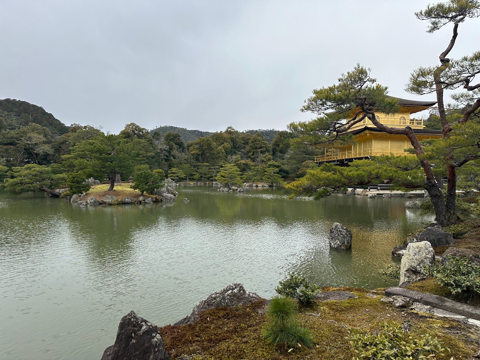 El Espejo del Estanque (Kyoko-chi) rodea el Pabellón Dorado y cuenta con varias pequeñas islas y piedrasdispuestas estratégicamente como parte del diseño zen.