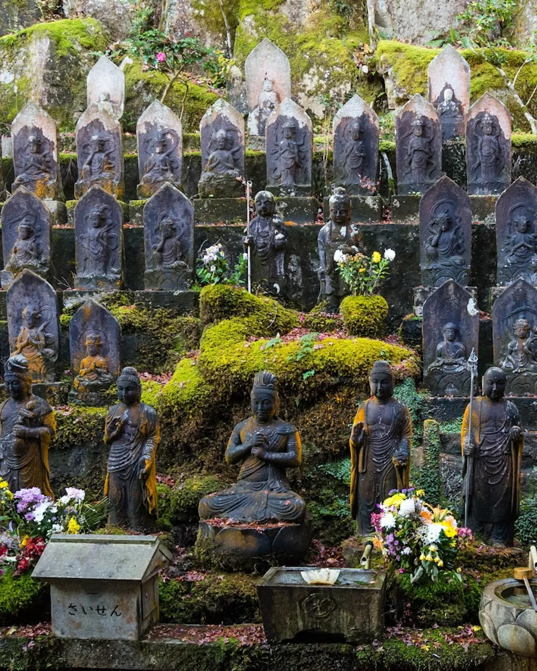 Jizō y pequeñas ermitas cubiertas de musgo a lo largo del valle.
