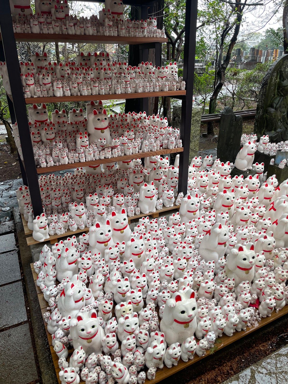 Al caminar por el templo, te encontrarás con cientos de estatuillas blancas de maneki-neko de diferentes tamaños, dejadas por visitantes como ofrendas para atraer fortuna. Además, el templo en sí es hermoso, con su arquitectura tradicional, jardines tranquilos y un ambiente sereno perfecto para una visita relajada.