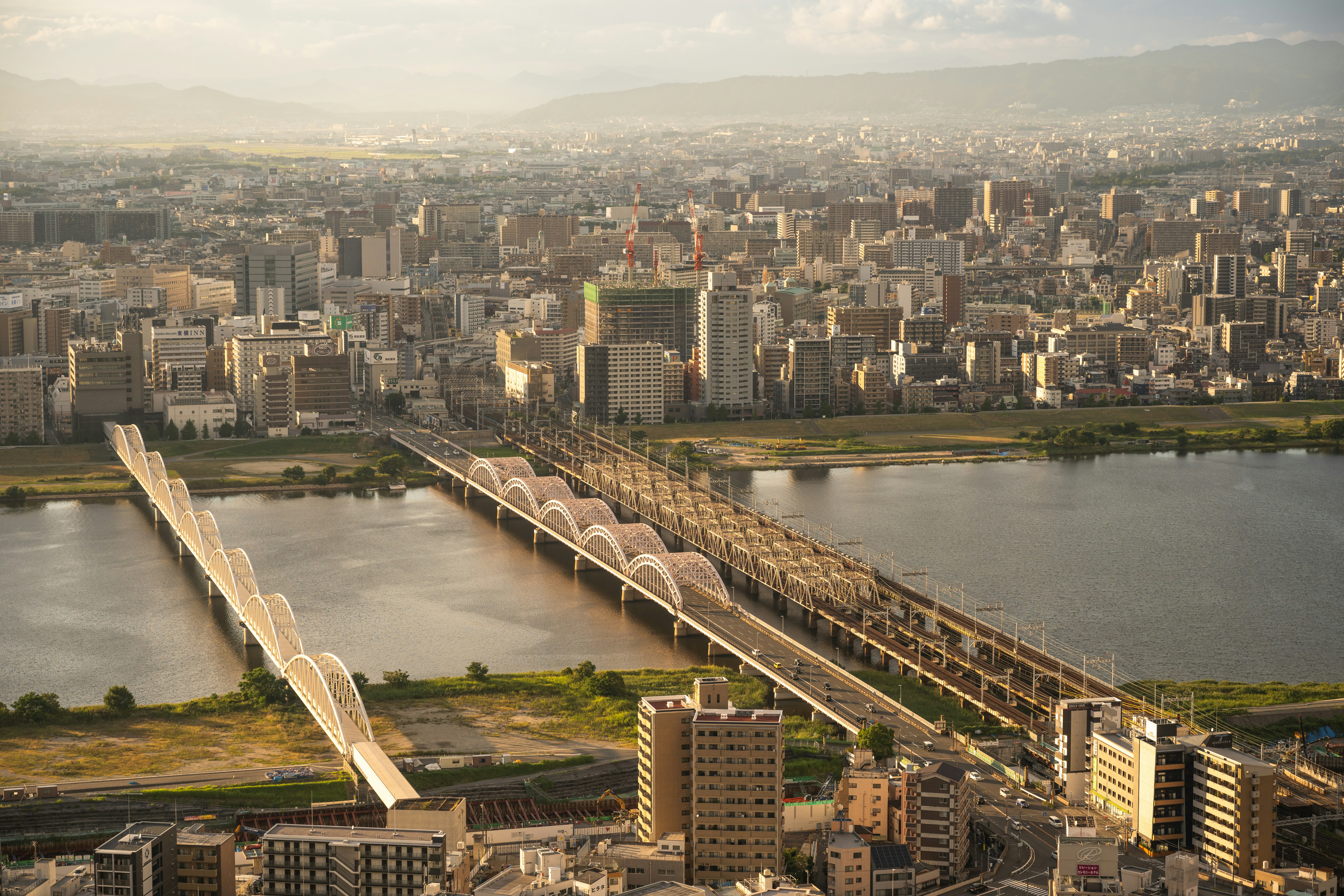 Open-air deck: unobstructed views of Yodo River, Osaka Bay direction, and the rail yard ballet below.