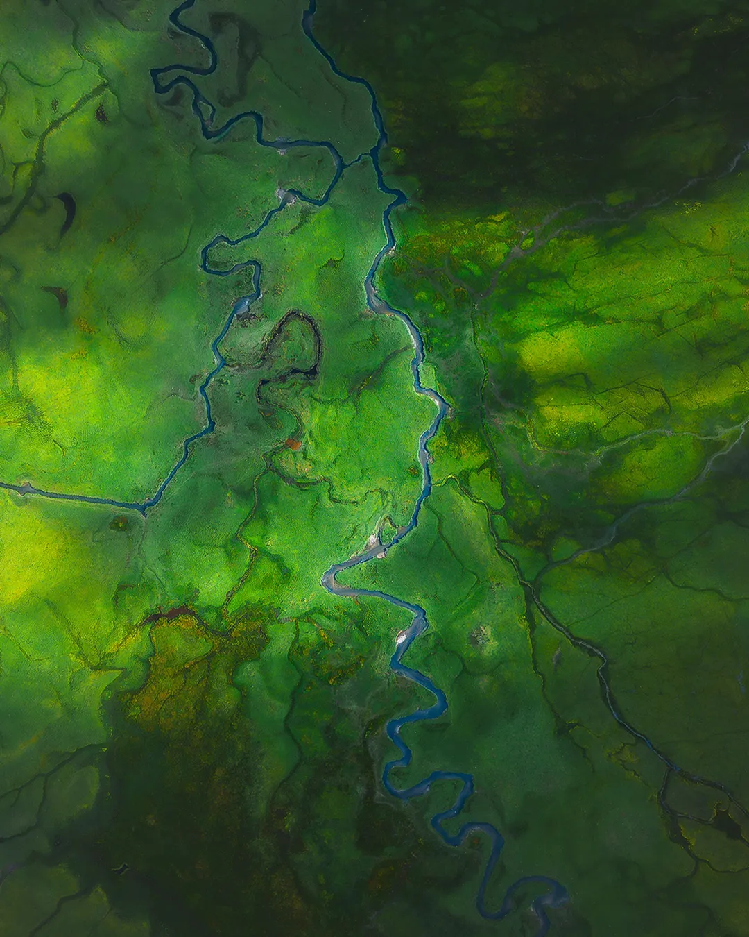 The Phobjikha Valley feels endless — a vast, open landscape where nature moves in slow, graceful patterns. From above, the valley reveals its most hypnotic feature: the winding river system, carving soft curves through layers of green like brushstrokes on a canvas. The shapes feel organic and fluid, constantly changing with the seasons, light, and water levels. Even without a drone, higher viewpoints already give a strong sense of this scale — wide, open space, gentle hills, wetlands, and the quiet rhythm of nature.