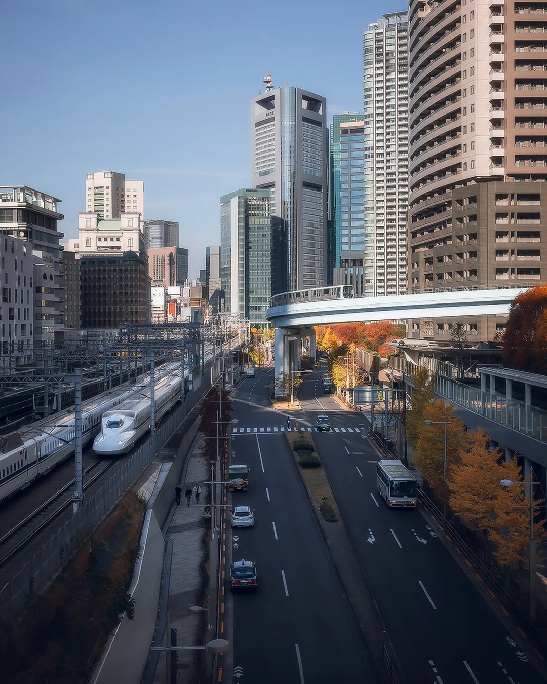This photo spot is located on the pedestrian deck at Takeshiba Pier, accessed via the walkway from Hamamatsucho Station. Once you take the elevator to the highest level, the view opens up into two very different perspectives. One side offers clean lines and depth, while the other feels more open and layered, making it easy to switch between compositions without moving far.