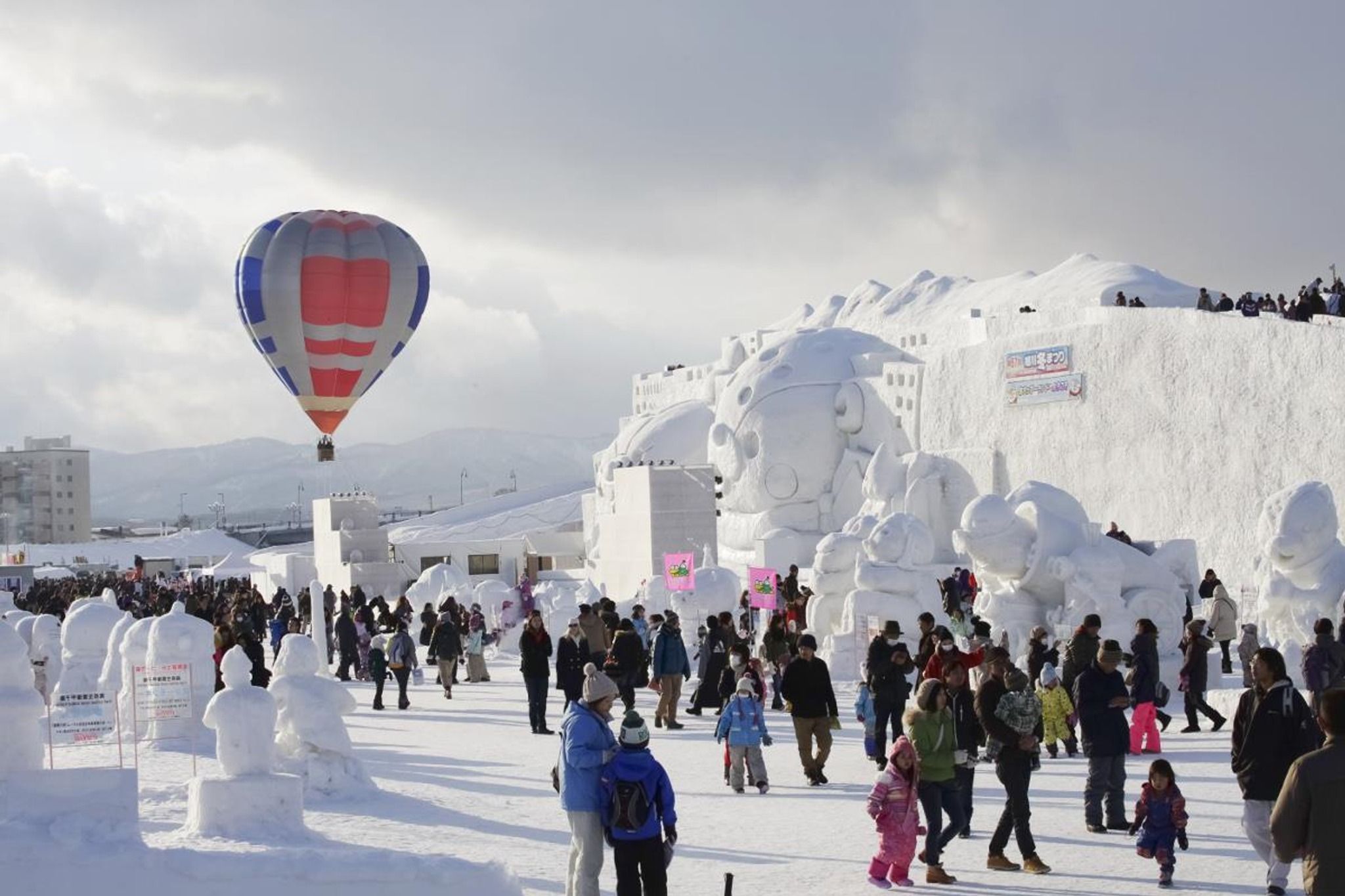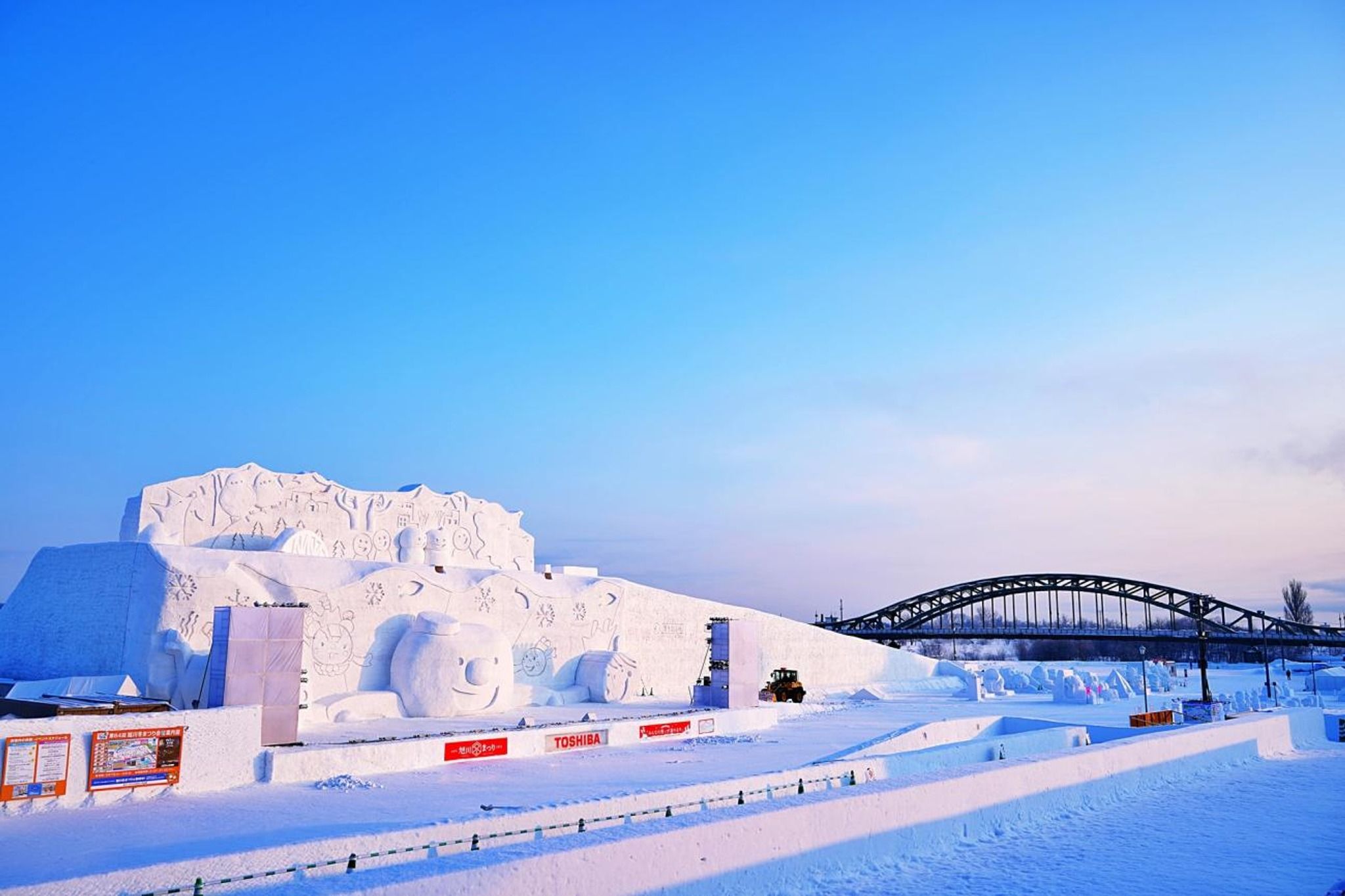 Asahibashi Riverside (Tokiwa Park): This site features a world-record-scale snow sculpture that serves as a massive stage for music and performances. Visitors can enjoy snow slides (including a 100-meter long slide), a snow maze, and snowmobile-pulled raft rides.