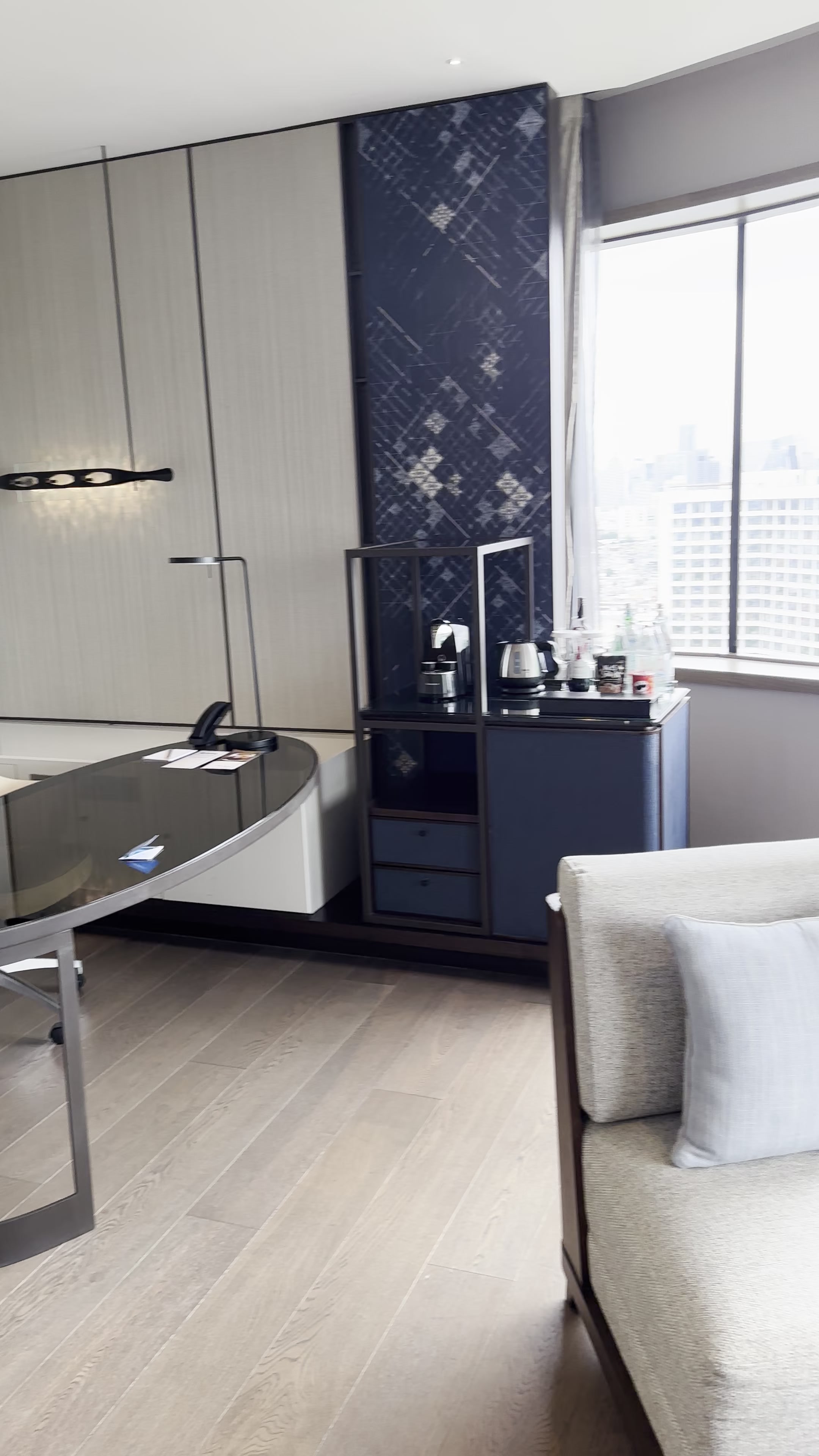 All rooms have stunning views of the river and cityscape to the east. Standard accommodations have plush beds that face large horizontal windows as if looking at a movie screen featuring Bangkok. You can expect bottled water, coffee and tea, and fresh fruit daily.