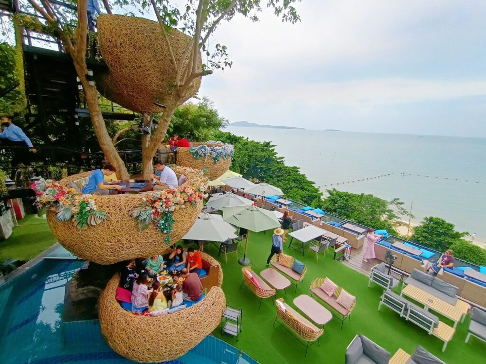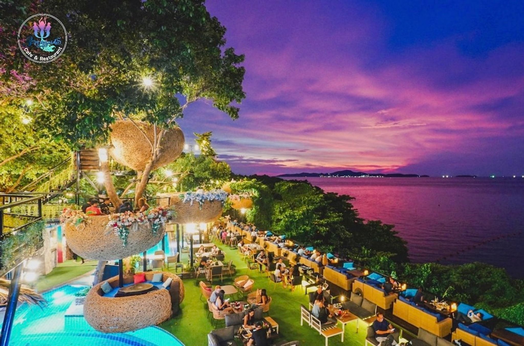 Located in Pattaya City, just near the charming Veruna Yacht Club and Chocolate Factory, 3 Mermaids is an exquisite seafood restaurant offering mesmerizing sunset views. The restaurant has an idyllic atmosphere, ideal for a romantic dinner or a night out with friends. The decor is unique and eye-catching, with various luxurious seating options like bird-nest-shaped private dining areas and outdoor sofas that lead to a trampoline styled area with cushions where you can lay down flat and take in the stunning view. A variety of drinks are offered while prices range from 99 Baht for soft drinks to over 5000 Baht for wines. Appetizers include delicious grilled prawns with seafood sauce and potato crab cream soup, all perfect accompaniments to the beautiful backdrop. Guests can also enjoy live music and indulge in decadent desserts such as chocolate lava cake or panna cotta. 3 Mermaids is certainly an elite destination for special occasions or a lovely escape to watch the sun go by.