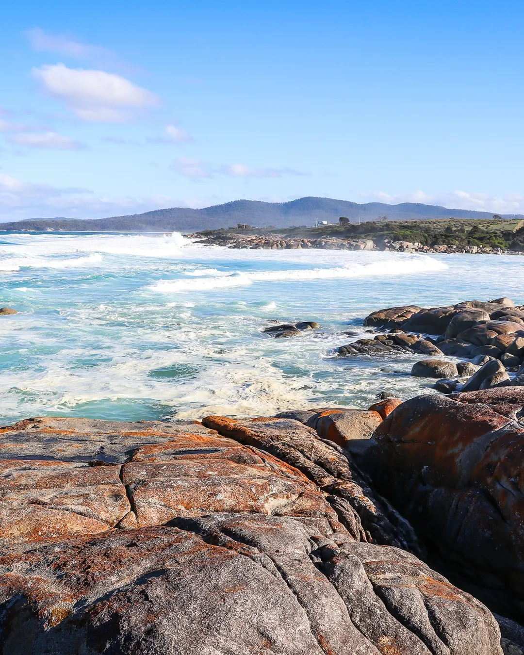 Sandy beach with orange granite boulders