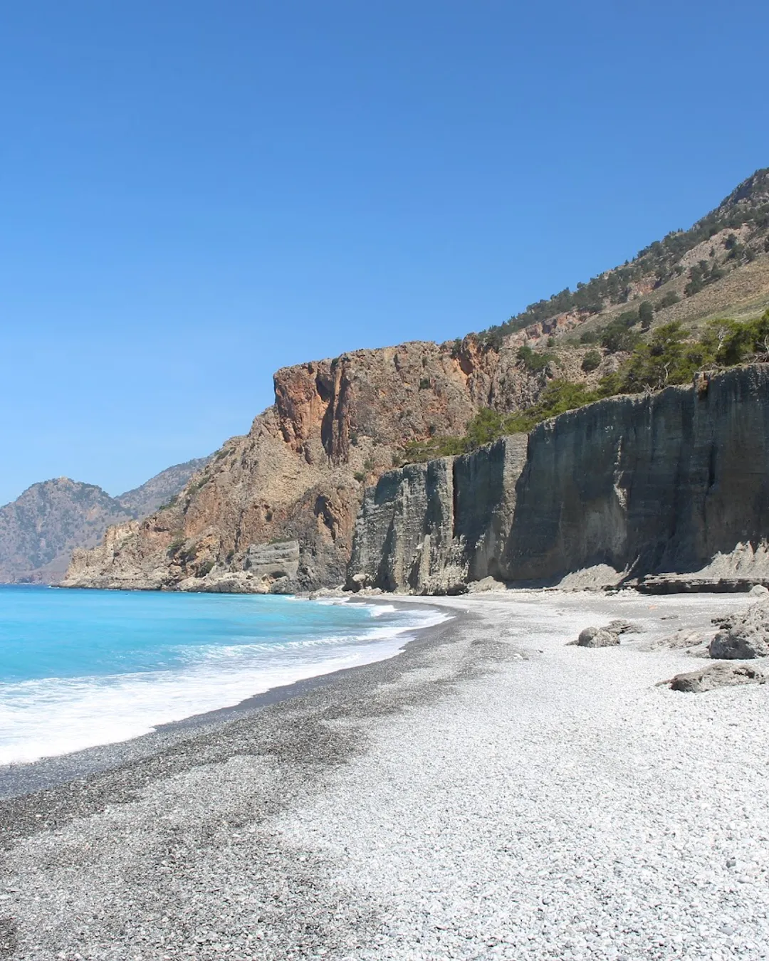 Get ready for an adventure to one of Crete's best-kept secrets, Domata beach. Tucked away along the southern coast, this isn't a spot you can just drive up to. The easiest way to arrive is by hiring a boat from Agia Roumeli, which is an experience in itself. For the truly adventurous, you can tackle a strenuous section of the E4 hiking trail, a challenging 3-4 hour trek along high cliffs that rewards you with breathtaking views and the promise of total seclusion. Once you arrive, you'll likely have this stunning pebble beach, with its crystal-clear waters and dramatic, layered cliffs, all to yourself.